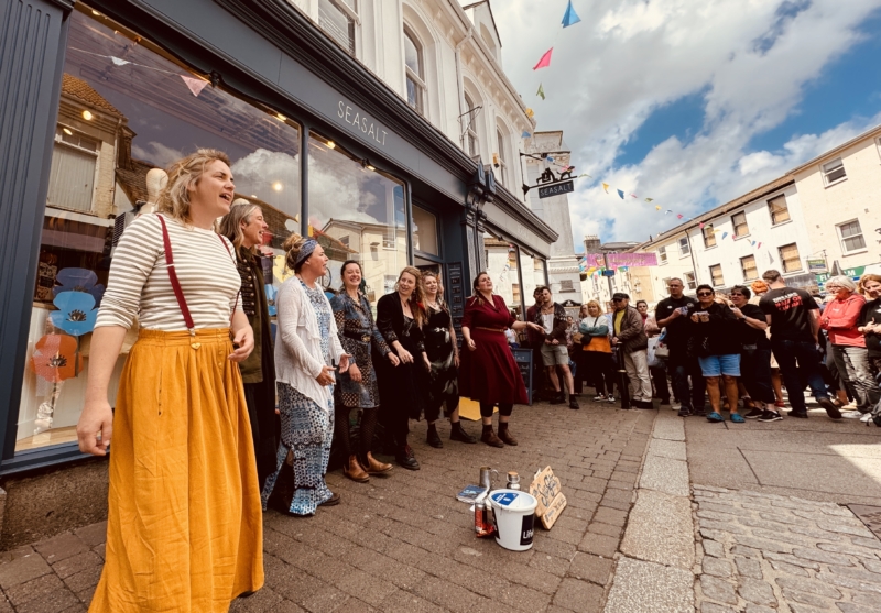 The frontage of Seasalt Cornwall’s Falmouth store plays host to unamplified a cappella performances throughout the festival weekend, with groups taking to the street to sing in the traditional busking style. No stage, no amplification — just voices in the open air.